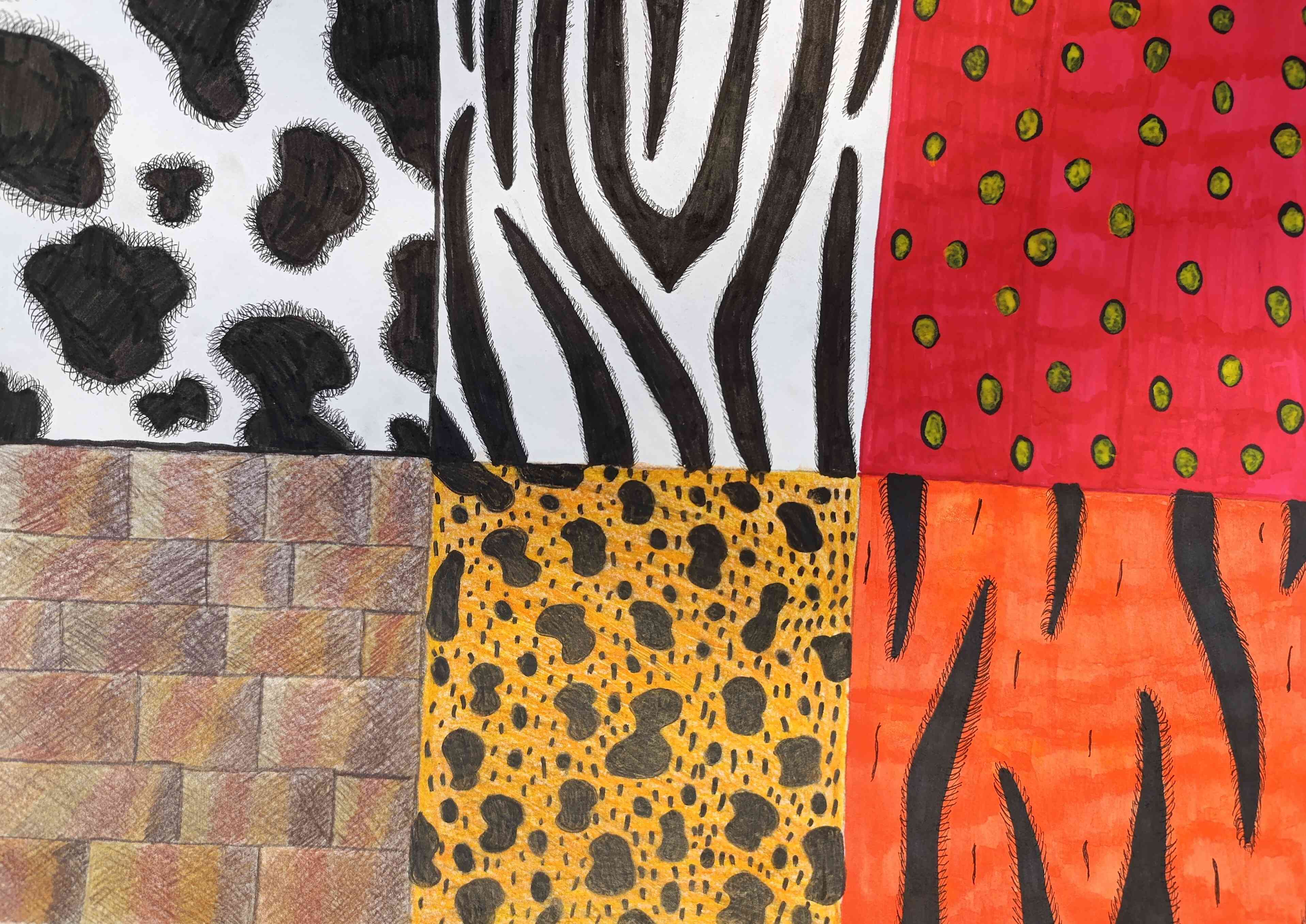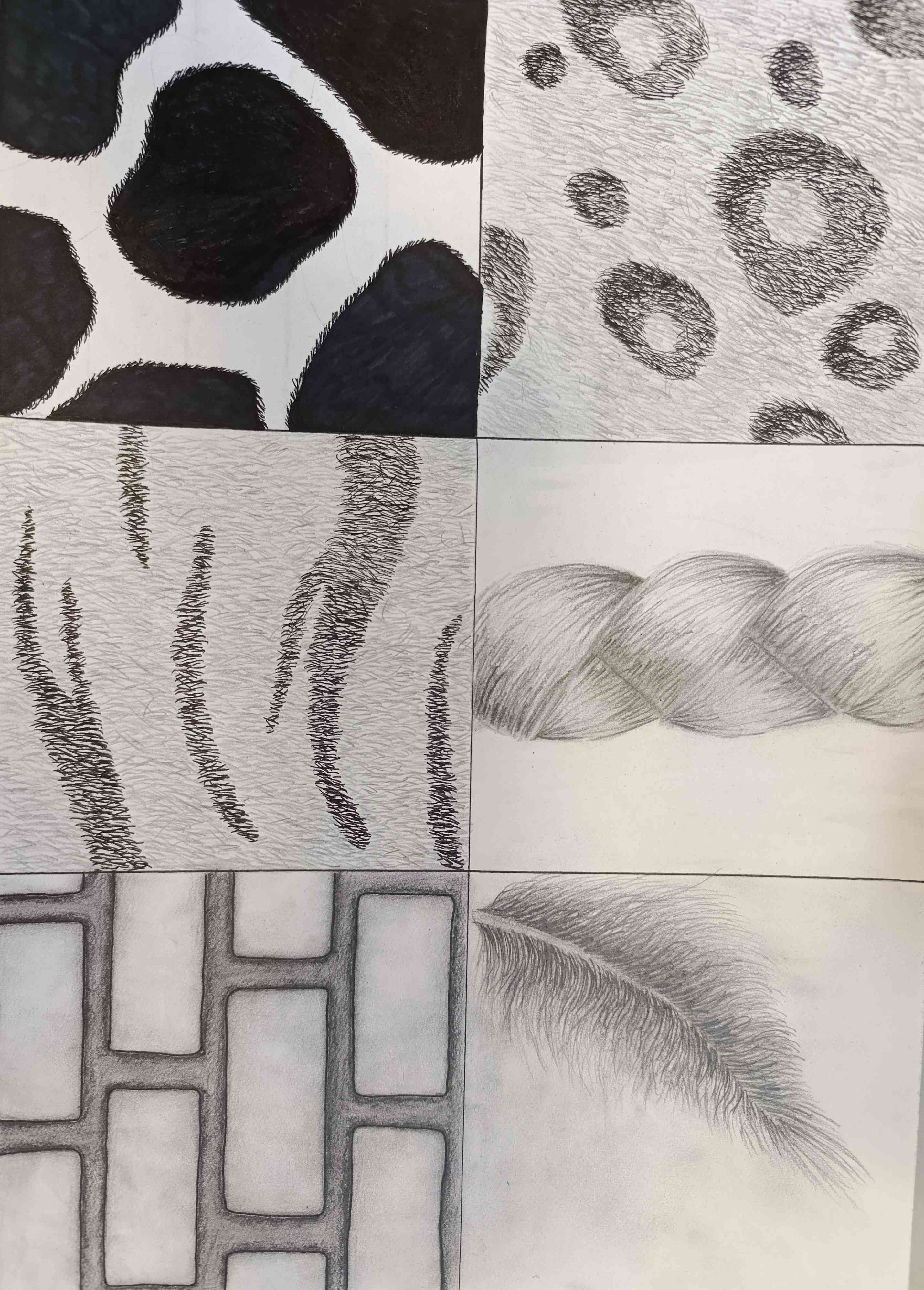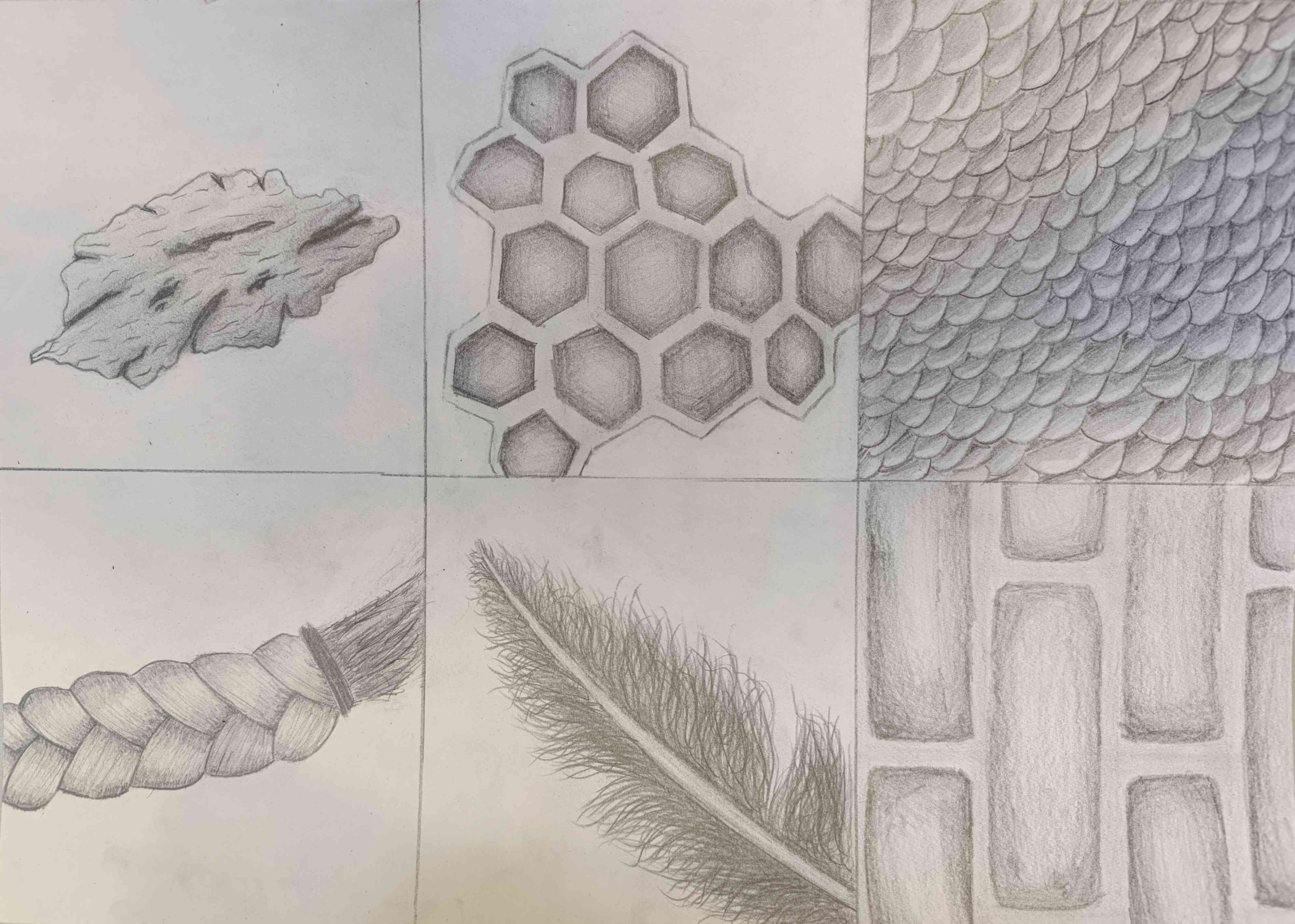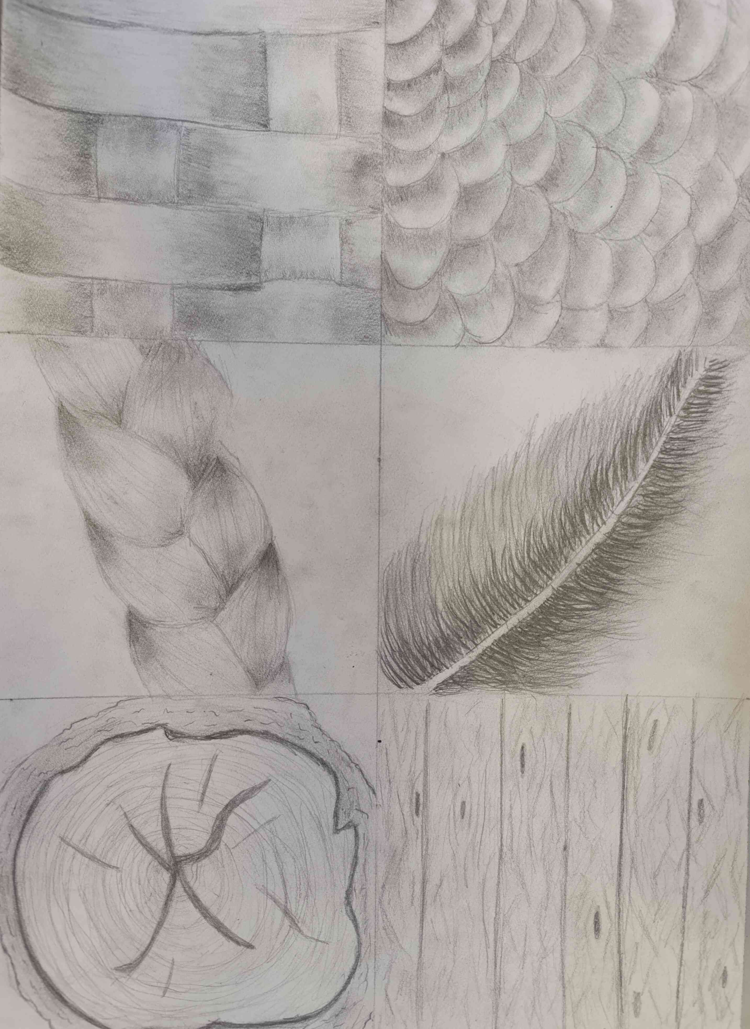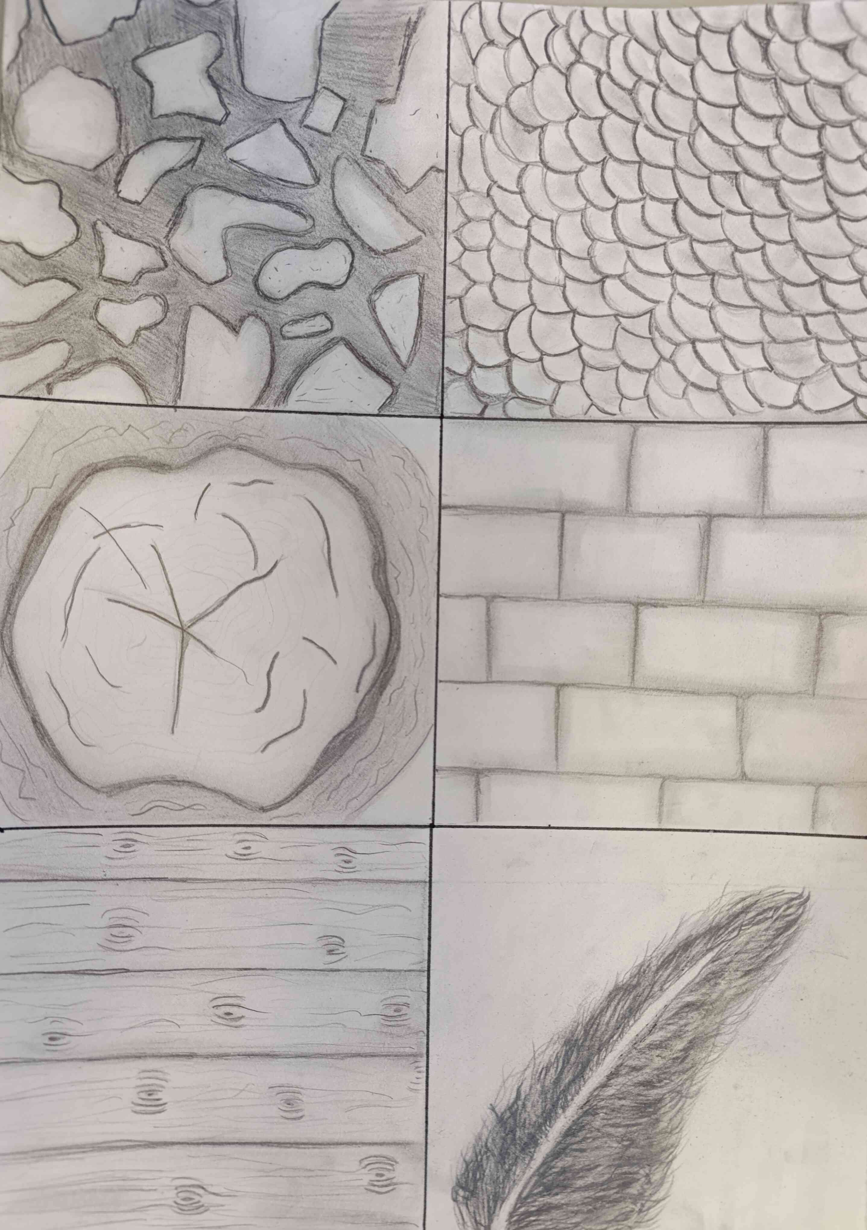 SR.: Skolēni zīmē 6 tekstūras no dabas formām – koka miza, spalva, akmens, ūdens u.c.