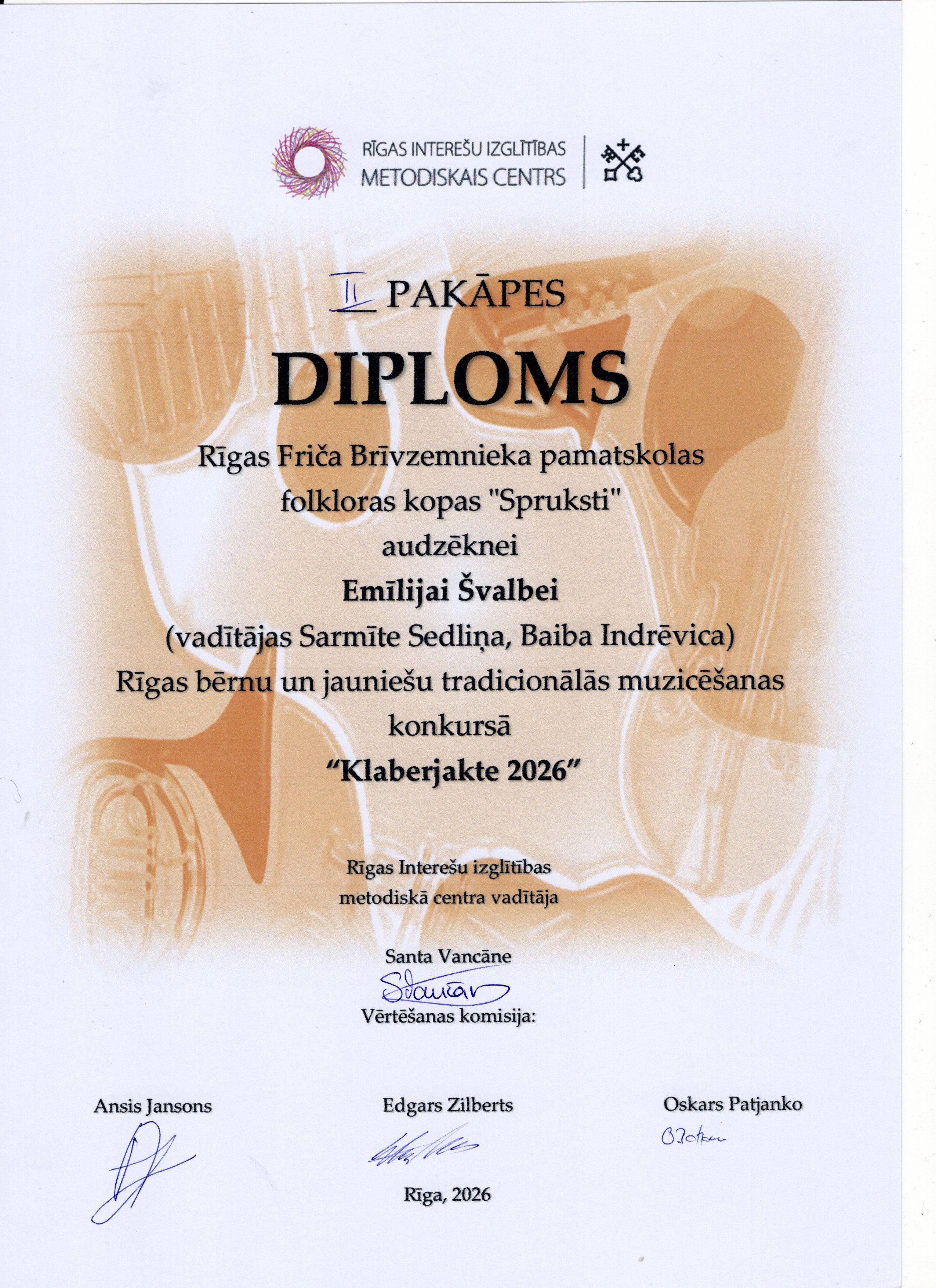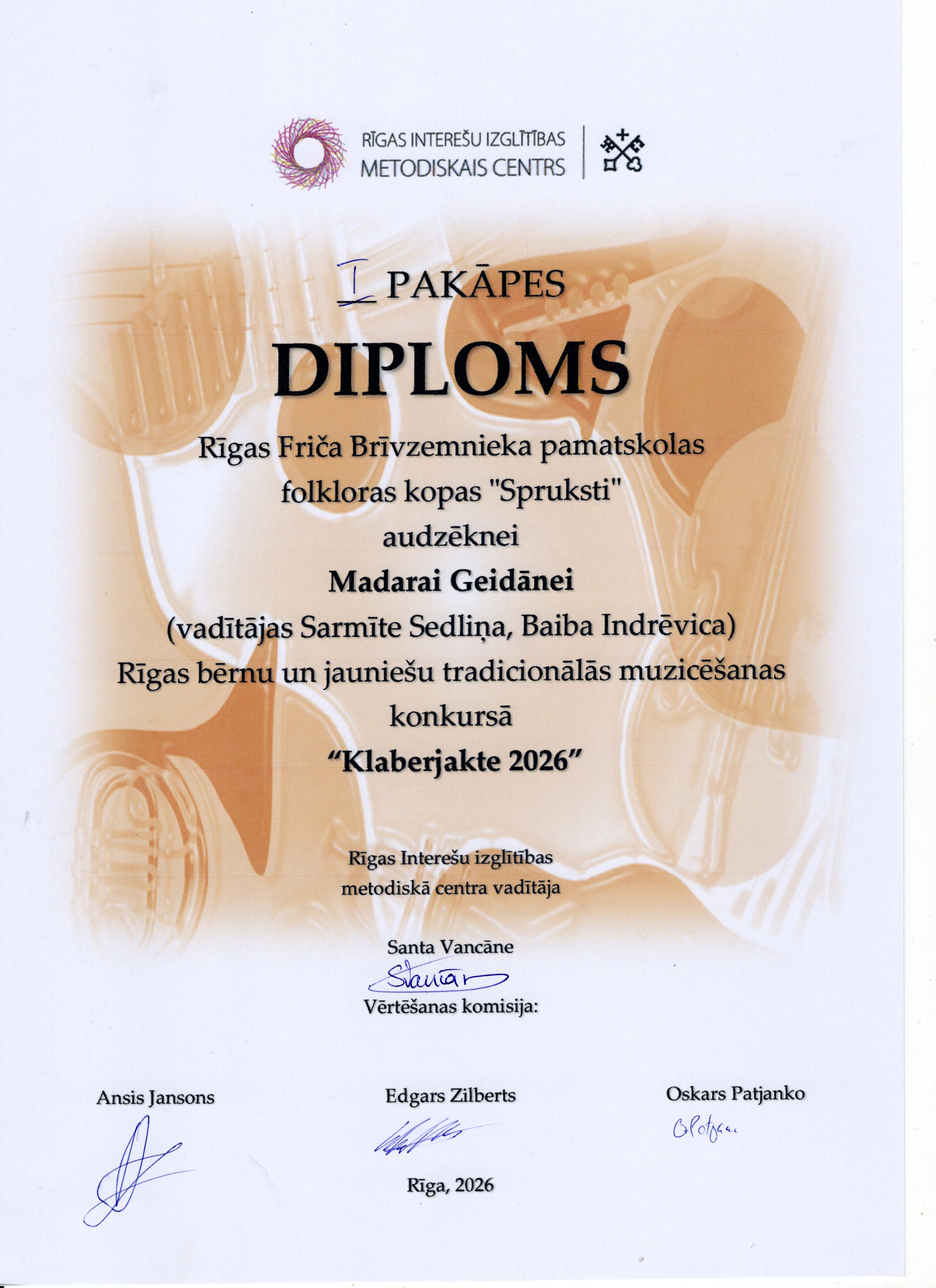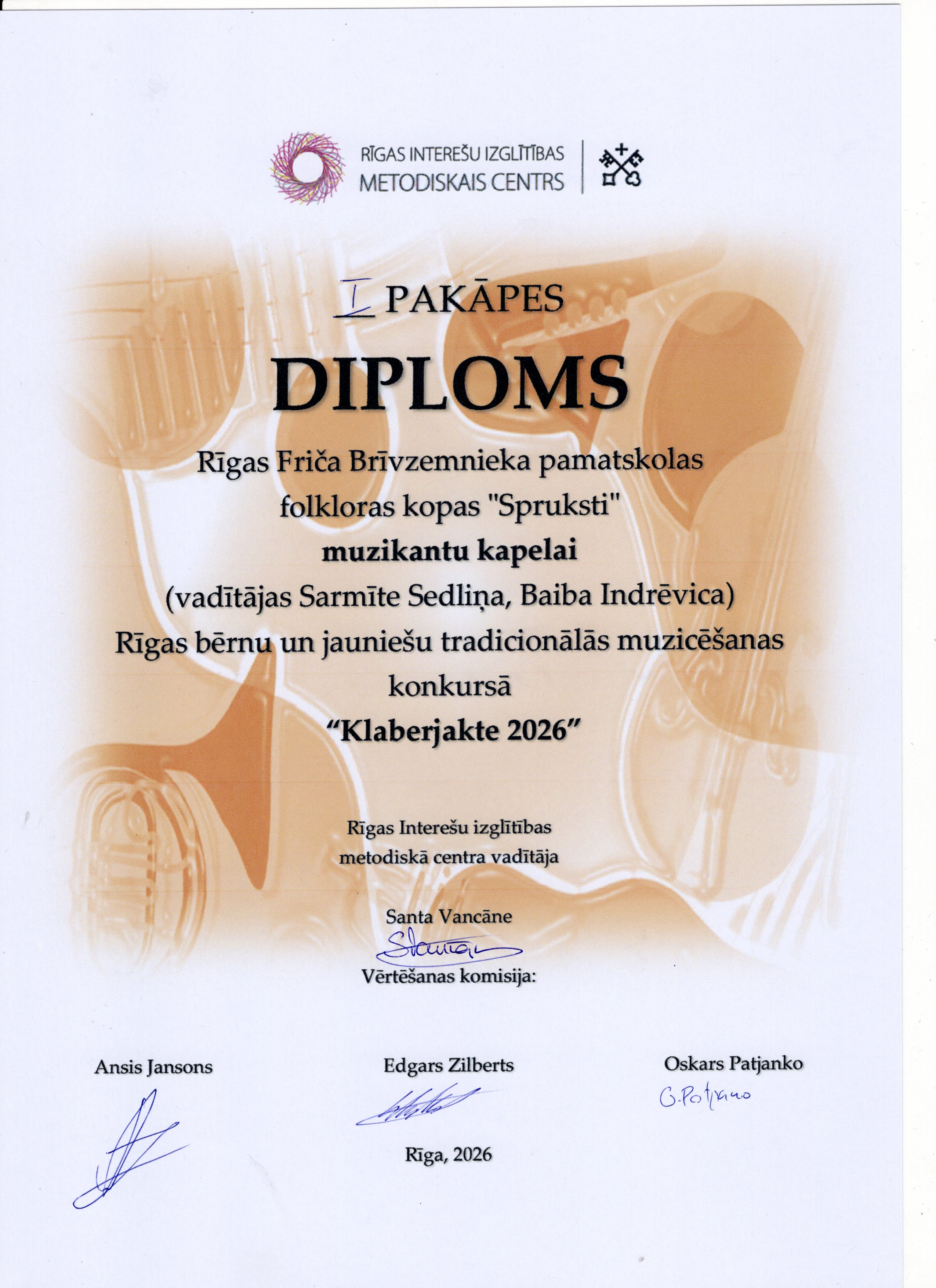 Šī gada 12. aprīlī Bērnu un jauniešu centrā “Rīgas Skolēnu pils” satikās Rīgas brašākie muzikanti, lai piedalītos ikgadējā tradicionālās muzicēšanas konkursā “Klaberjakte”. Konkursā varēja dzirdēt gan individuālos solistus, gan arī tautas mūzikas instrumentu kapelu uzstāšanos. Tradicionālajā muzicēšanas konkursā “Klaberjakte” ikviens dalībnieks izpilda divus skaņdarbus, muzicējot individuāli, duetā vai kapelā. Žūrija vērtē priekšnesumu atbilstību tradīcijai, dalībnieku tehnisko sagatavotību, muzicēšanas kvalitāti un kopējo skatuvisko pievilcību. "Spruksti" uzstājās individuāli, Madara Geidāne un Emīlija Švalbe spēlēja kokles, Adriāna Jāņa De Souza-Lobo priekšnesums skanēja uz mutes ermoņikām. Abas meitenes, Adrians un Krišjānis Balodis savu varēšanu parādīja arī muzikantu kapelu grupā un ieguva labu žūrijas vērtējumu un 1.pakāpes diplomu. Visi "Sprukstu" muzikanti pārstāvēs Rīgu konkursa finālā 25.aprīlī.