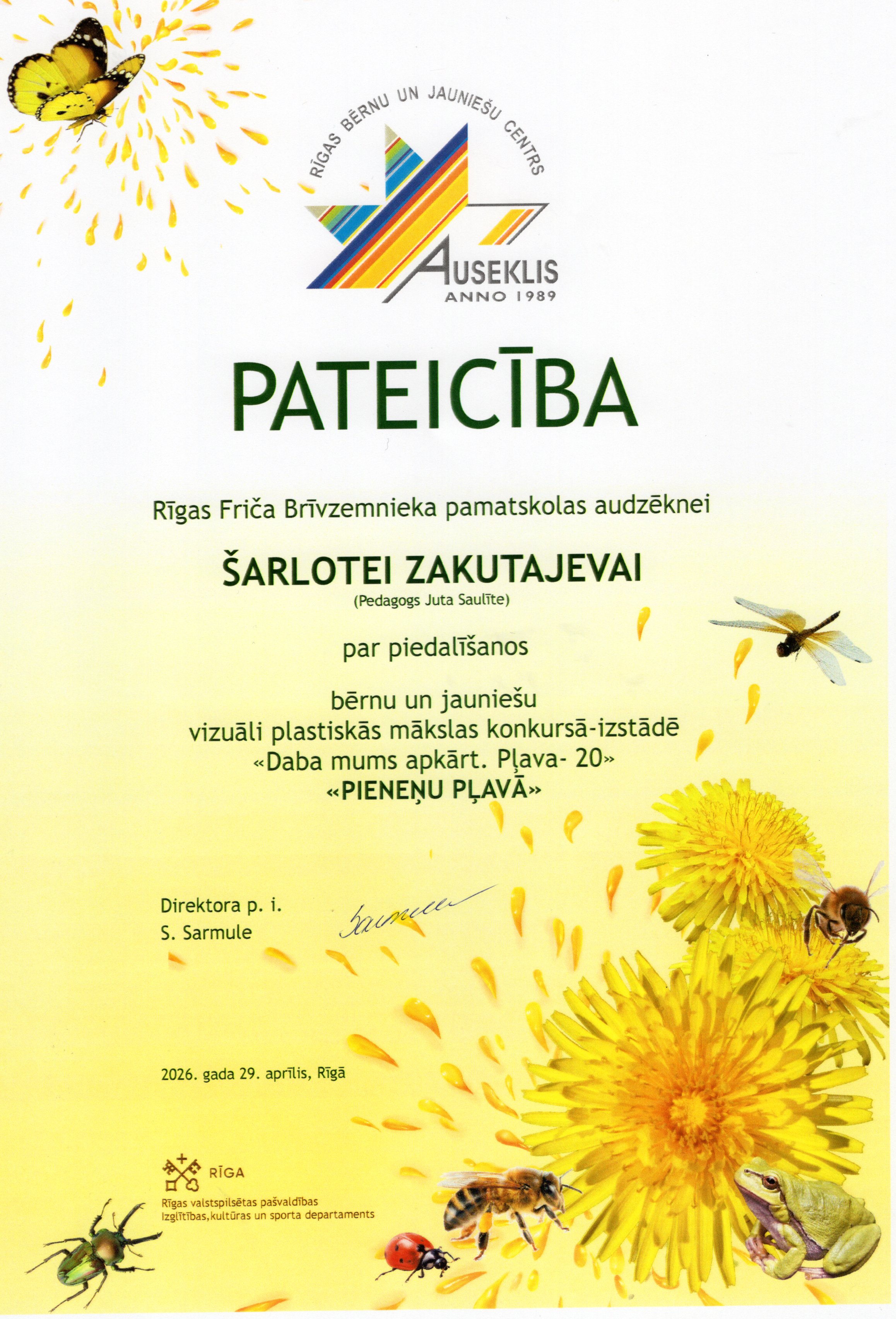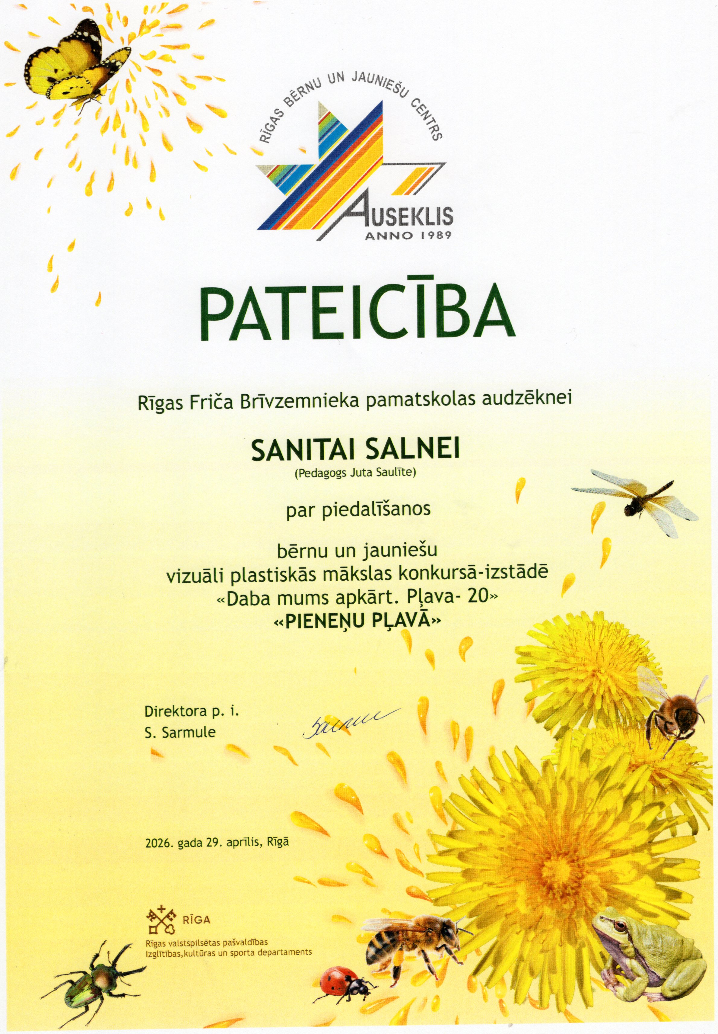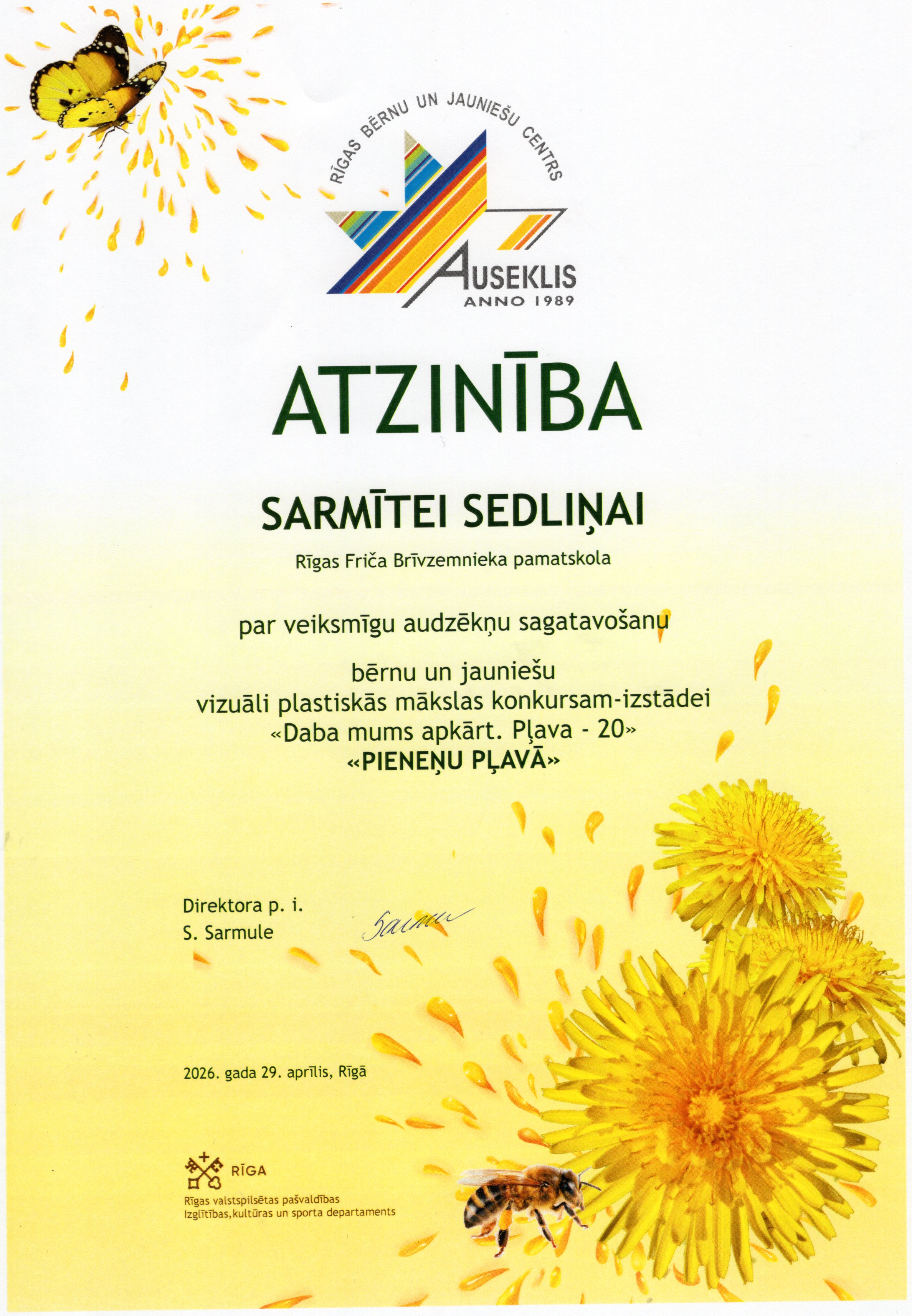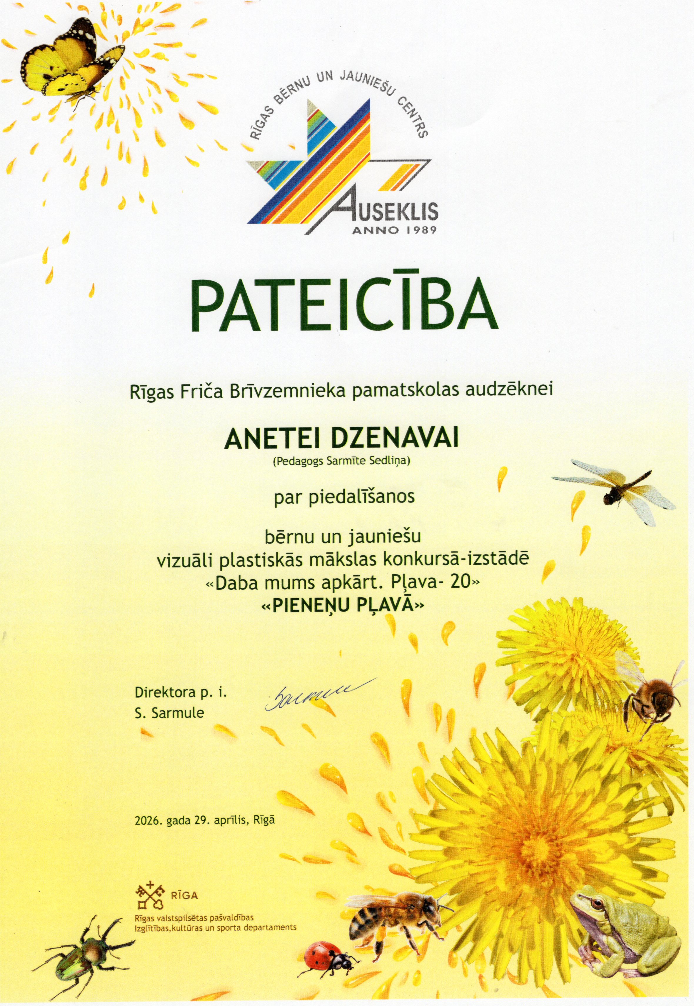 Rīgas bērnu un jauniešu centrs “Auseklis” sadarbībā ar Rīgas valstspilsētas pašvaldības Izglītības, kultūras un sporta departamenta Sporta un jaunatnes pārvaldi, aicināja skolu audzēkņus piedalīties Bērnu un jauniešu vizuāli plastiskās mākslas konkursā izstādē “Daba mums apkārt. Pļava 20”. Konkursa mērķis – motivēt bērnus un jauniešus apgūt jaunas zināšanas par vidi un mākslu, pētīt un izzināt Latvijas pļavu floras un faunas daudzveidību un to nozīmi dabā, un veidot radošu, vizuāli plastiskās mākslas darba kompozīciju par konkursa tēmu “Pieneņu pļavā”. Mūsu skolu konkursā pārstāvēja interešu izglītības pulciņu "Podziņa" un "Dandzis" meitenes skolotāju Jutas Saulītes un Sarmītes Sedliņas vadībā.