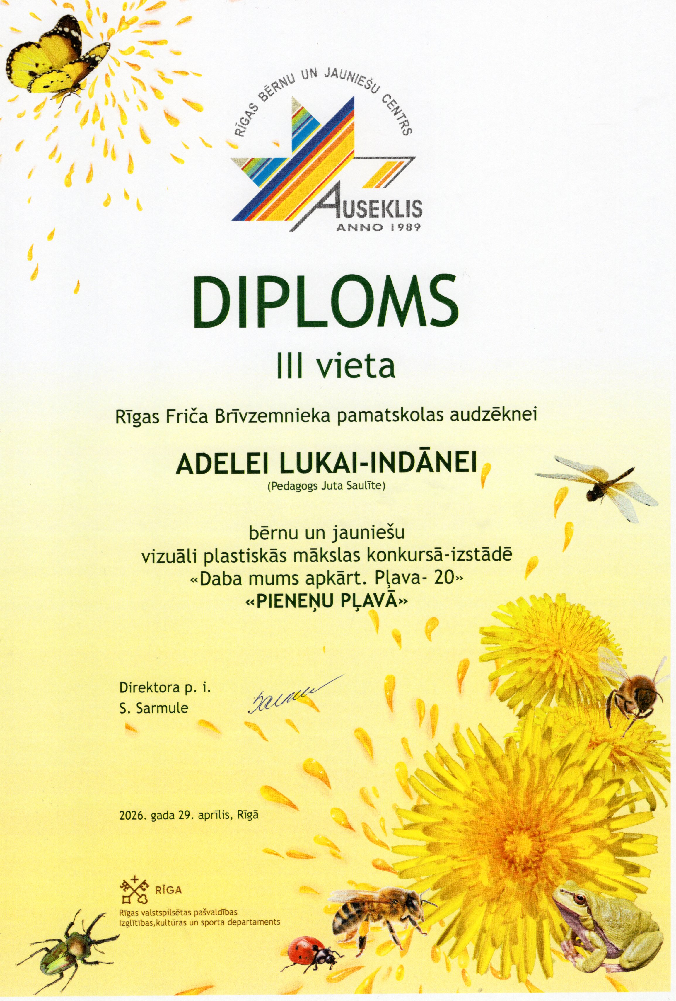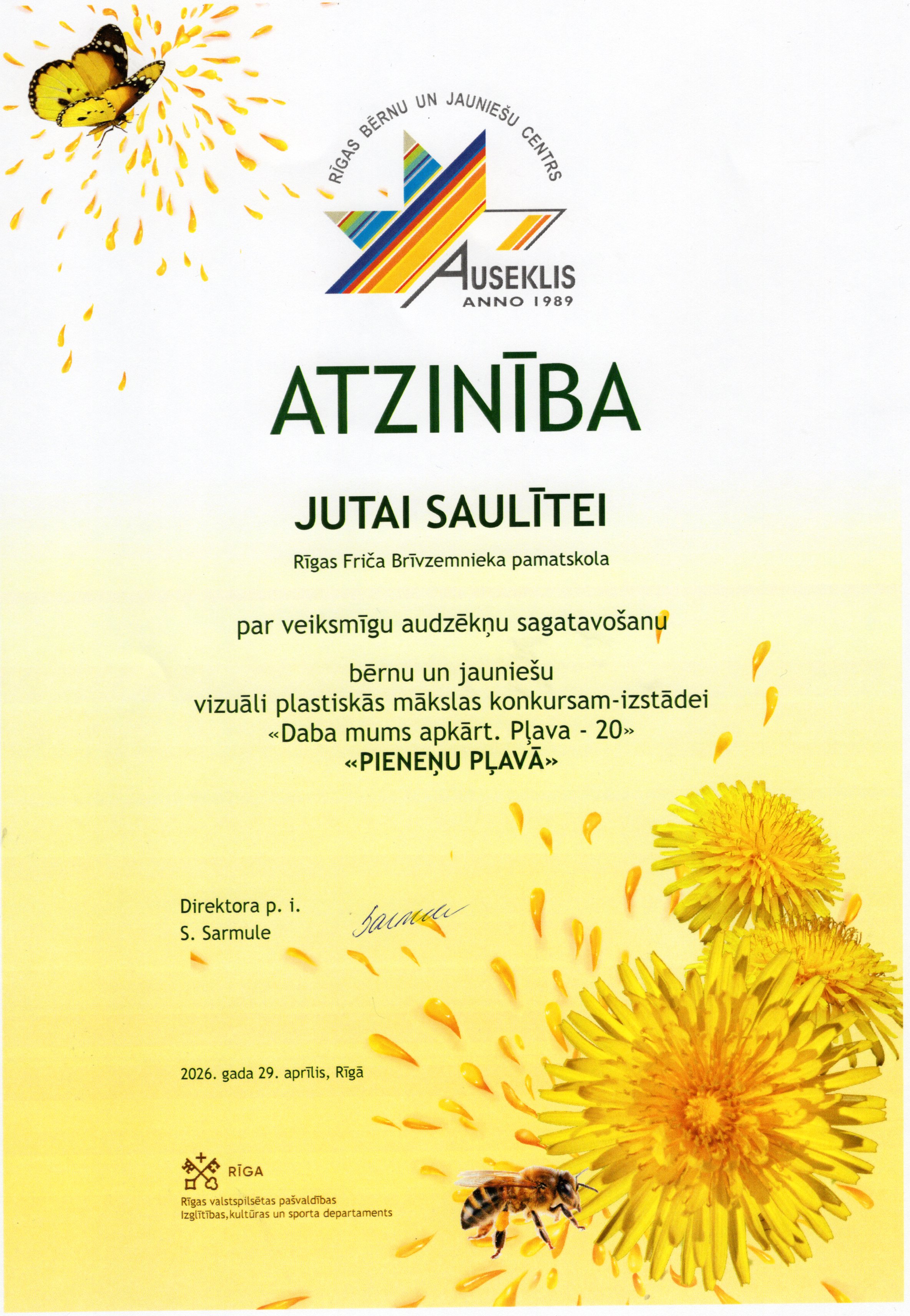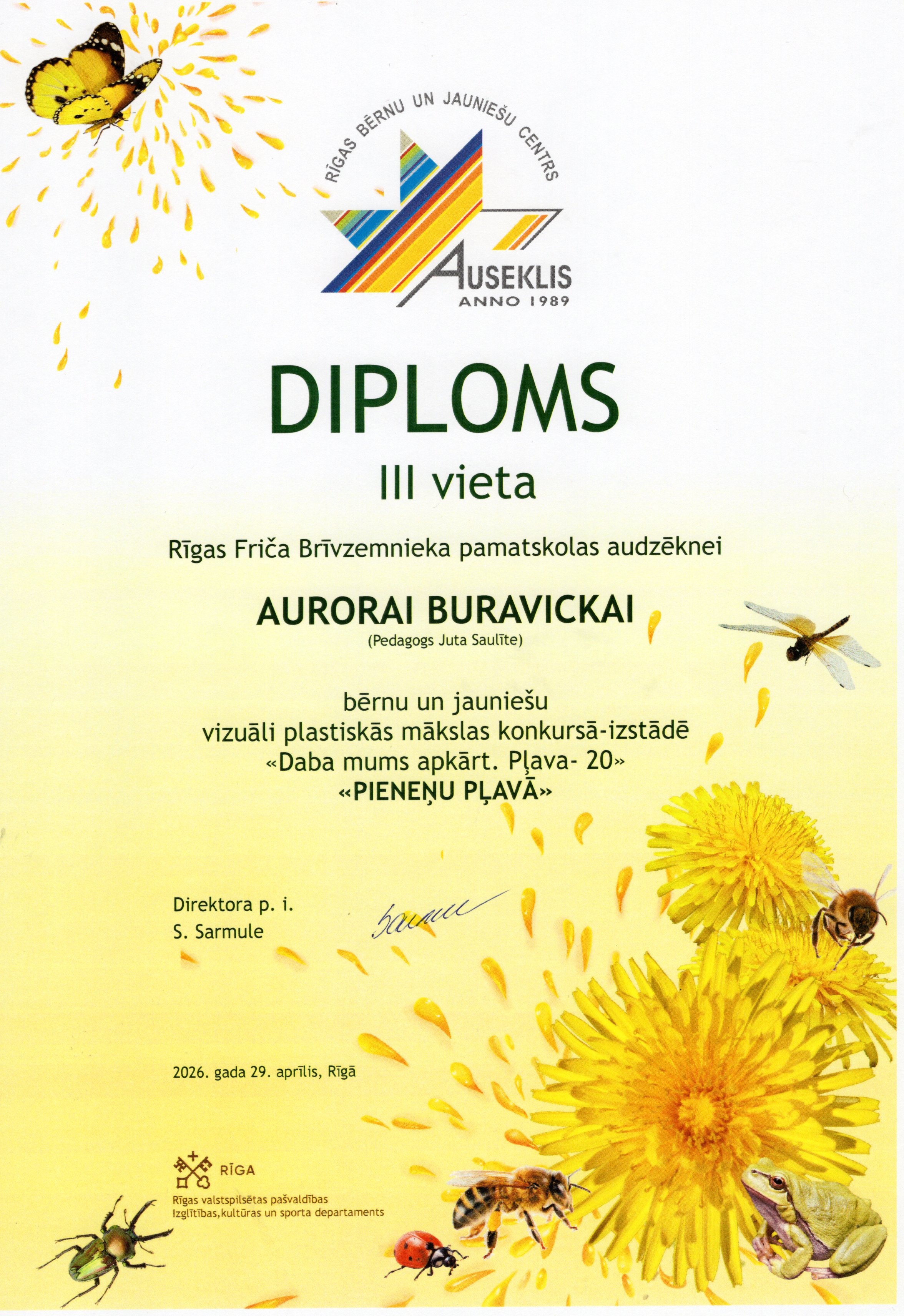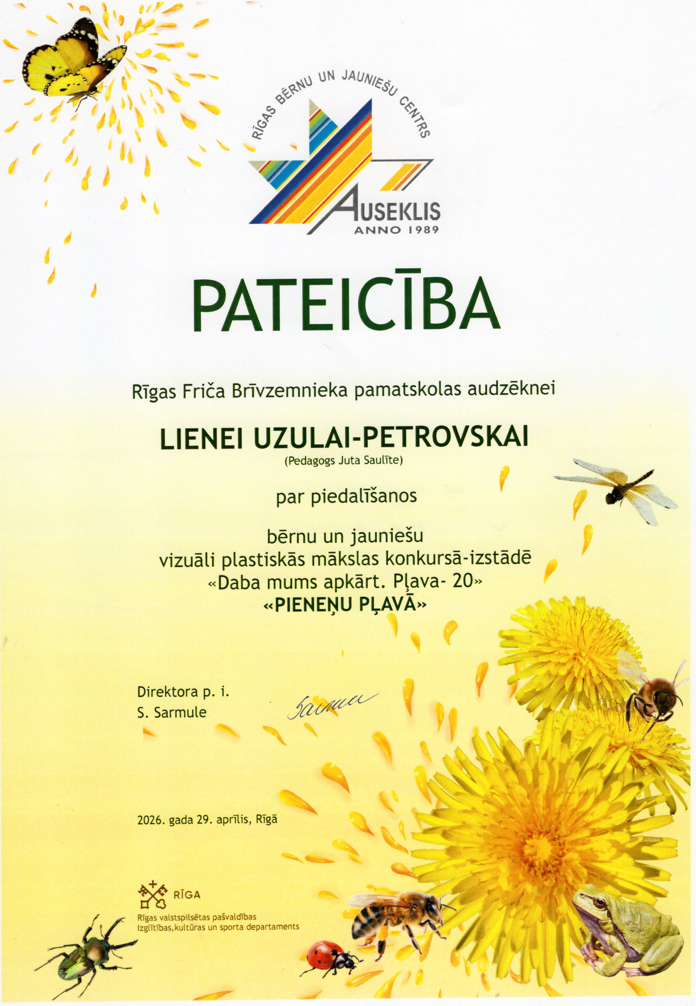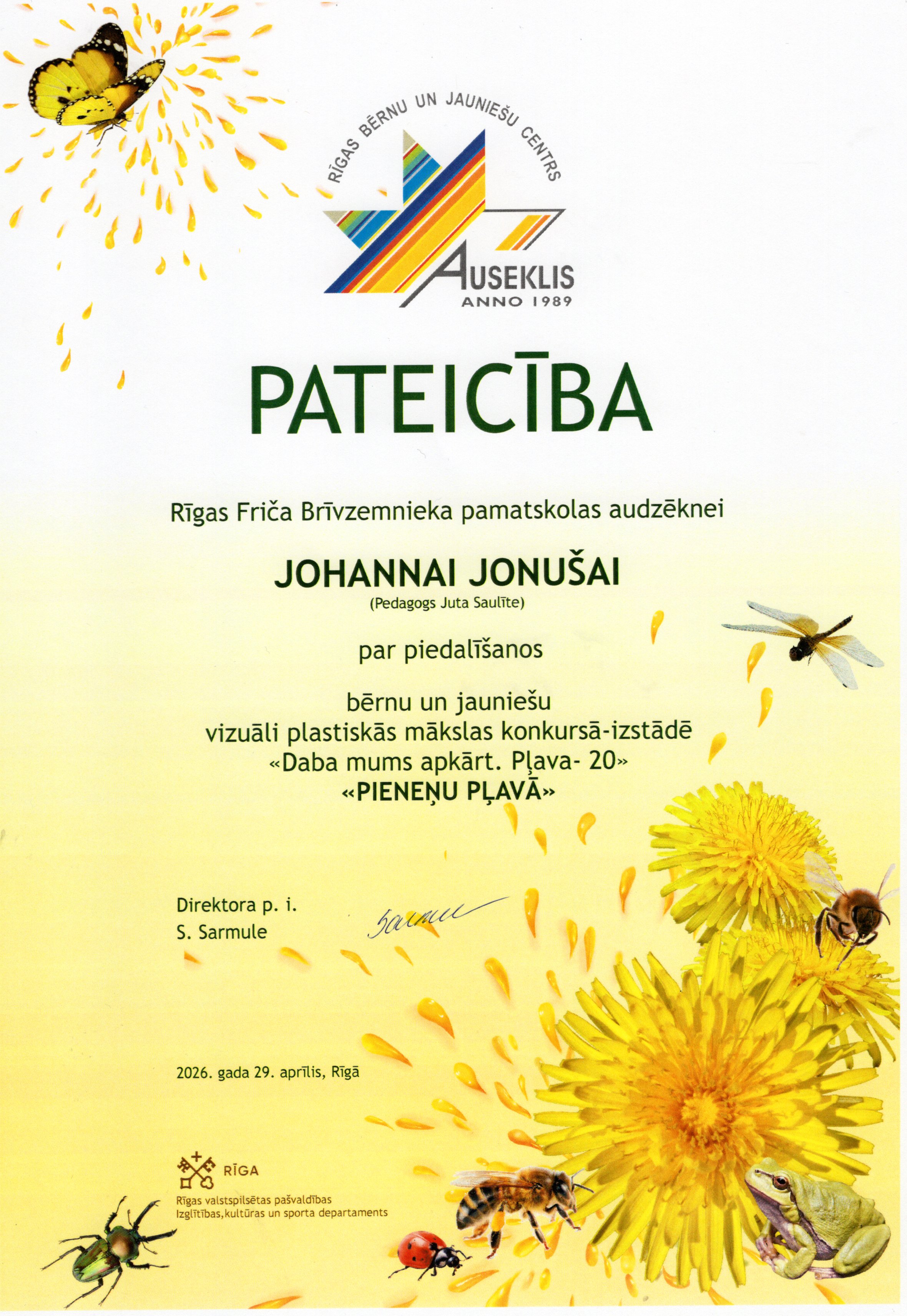 Rīgas bērnu un jauniešu centrs “Auseklis” sadarbībā ar Rīgas valstspilsētas pašvaldības Izglītības, kultūras un sporta departamenta Sporta un jaunatnes pārvaldi, aicināja skolu audzēkņus piedalīties Bērnu un jauniešu vizuāli plastiskās mākslas konkursā izstādē “Daba mums apkārt. Pļava 20”. Konkursa mērķis – motivēt bērnus un jauniešus apgūt jaunas zināšanas par vidi un mākslu, pētīt un izzināt Latvijas pļavu floras un faunas daudzveidību un to nozīmi dabā, un veidot radošu, vizuāli plastiskās mākslas darba kompozīciju par konkursa tēmu “Pieneņu pļavā”. Mūsu skolu konkursā pārstāvēja interešu izglītības pulciņu "Podziņa" un "Dandzis" meitenes skolotāju Jutas Saulītes un Sarmītes Sedliņas vadībā.