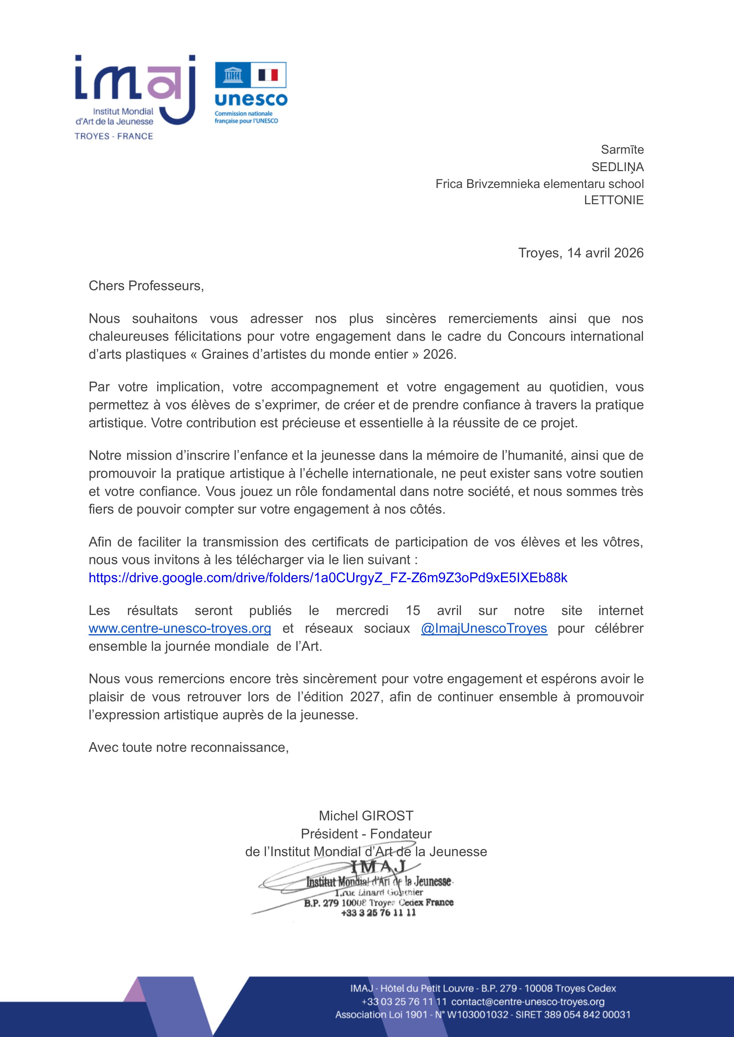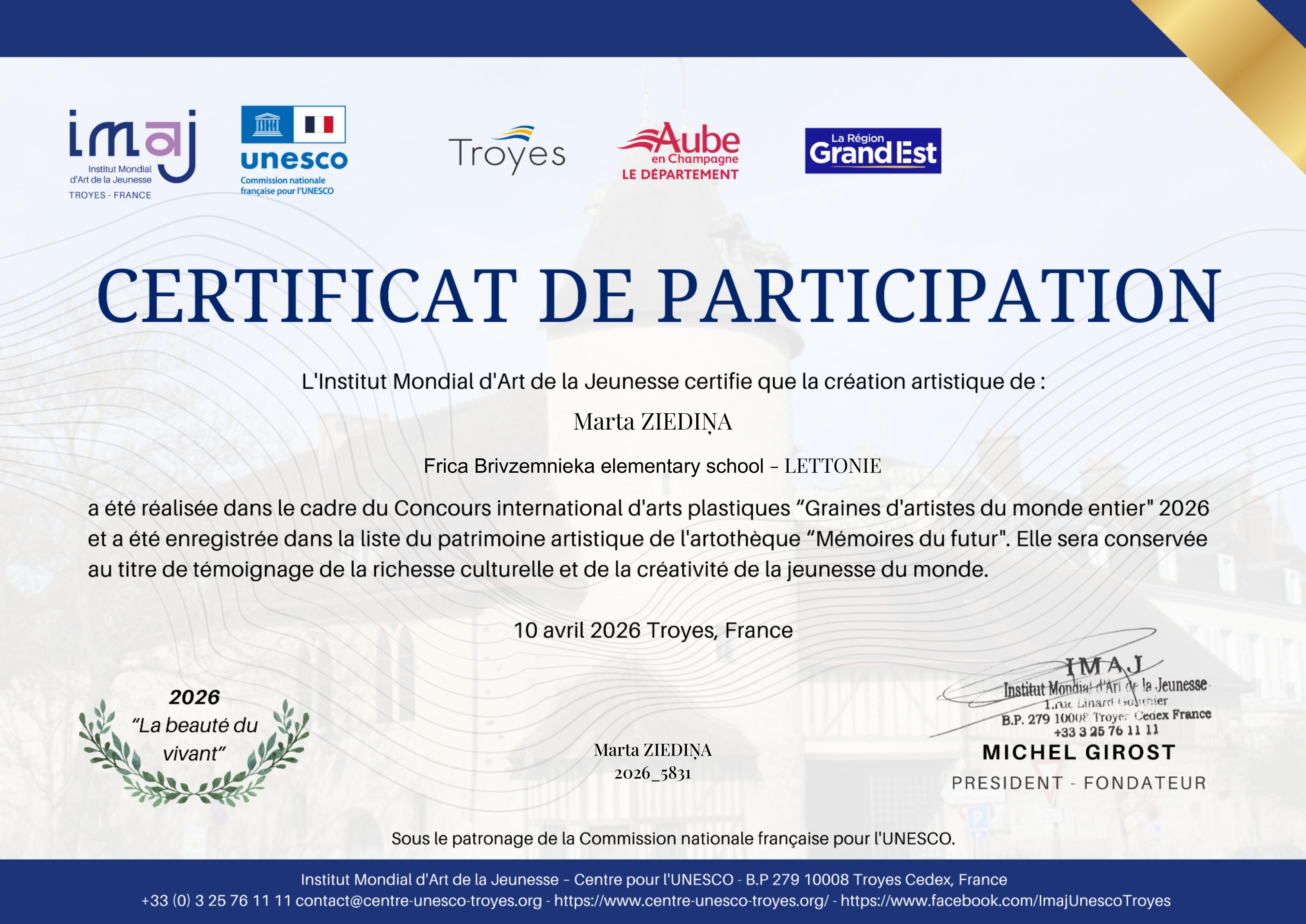 Vēlamies Jums izteikt mūsu vissirsnīgāko pateicību par Jūsu iesaisti Starptautiskā vizuālās mākslas konkursā Graines d’artistes 2026.