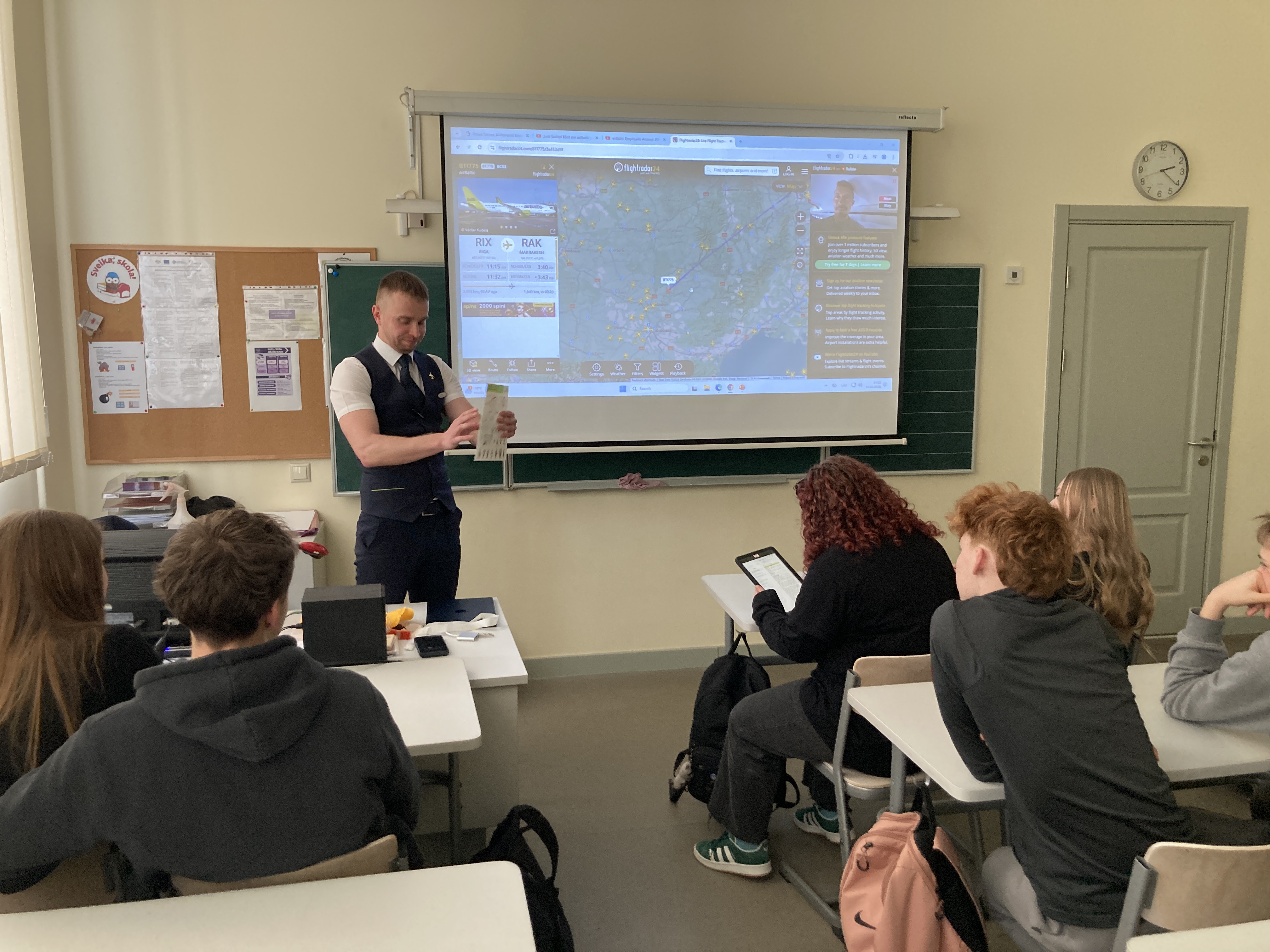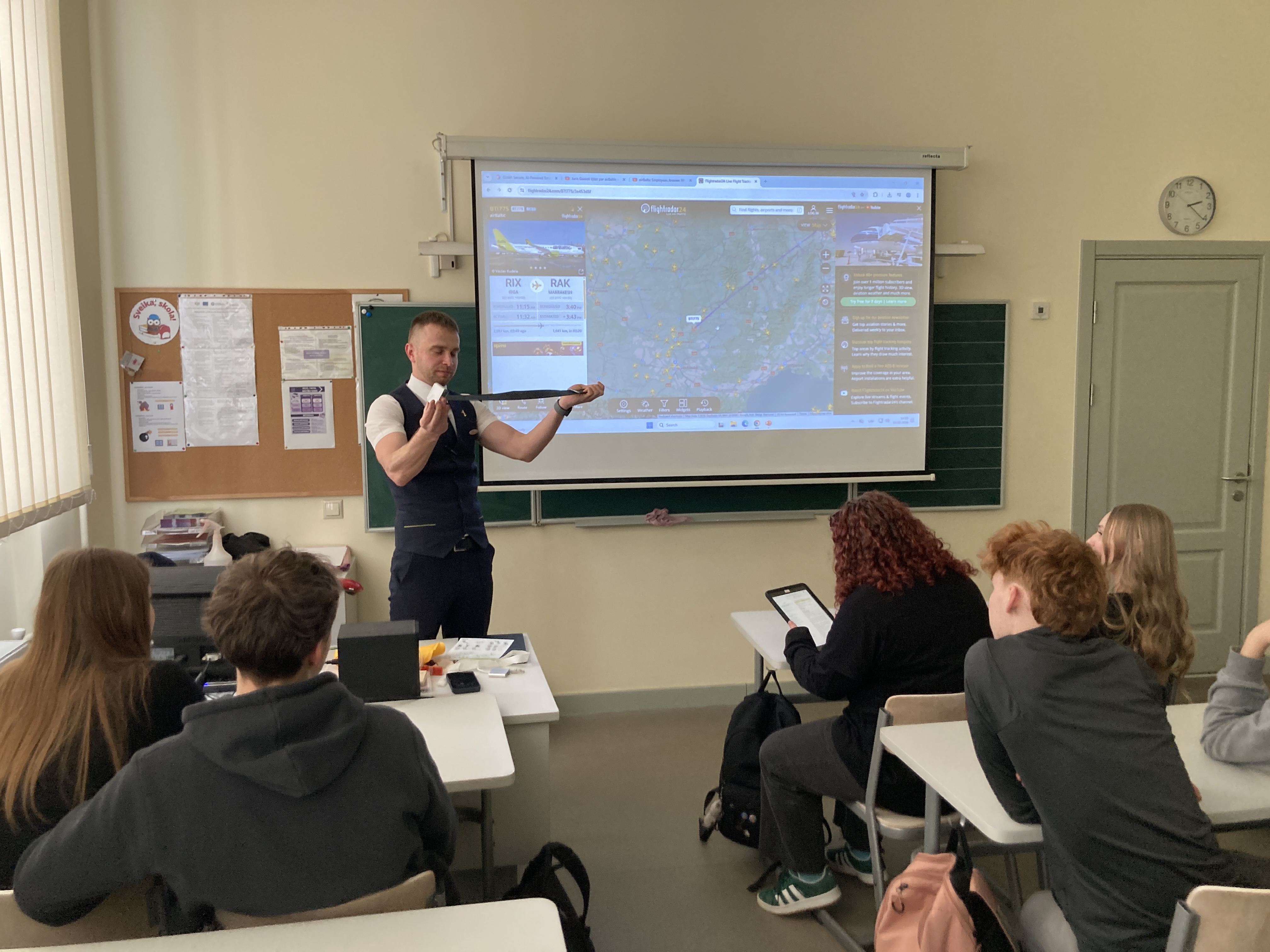 Nodarbības laikā skolēni uzzināja visu par stjuarta profesiju- kā var kļūt par stjuartu, kur var apgūt šo profesiju, kā arī par stjuarta darba ikdienu, par to, cik aizraujoša un reizē bīstama ir šī profesija. Tāpat Toms pastāstīja, ka šī profesija ietver sevī vēl citas profesijas. Stjuarti ir arī policisti, ārsti, psihologi, ugunsdzēsēji, viesmīļi un baristas. Stjuartiem ir jābūt gataviem šīs prasmes pielietot darbā ar pasažieriem lidojuma laikā. Nodarbības beigās skolēniem bija izdevība uzdot Tomam sev interesējošus jautājumus.