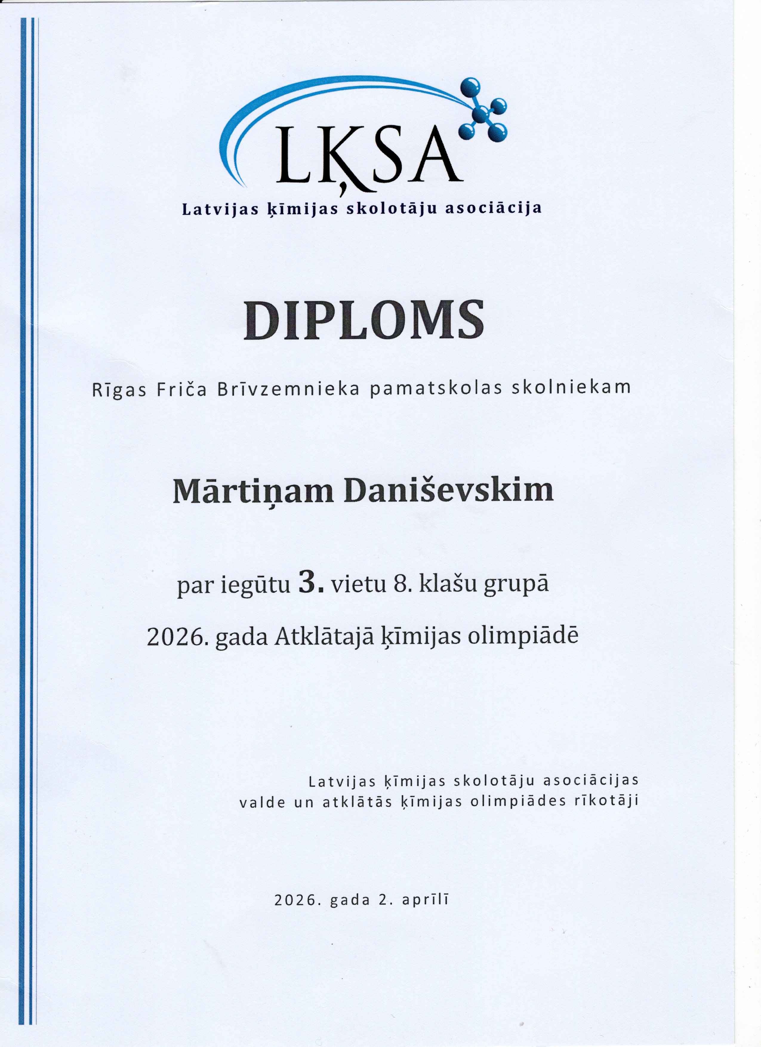 8.a klases skolēns Mārtiņš Daniševskis ieguvis 3.vietu atklātajā ķīmijas olimpiādē.