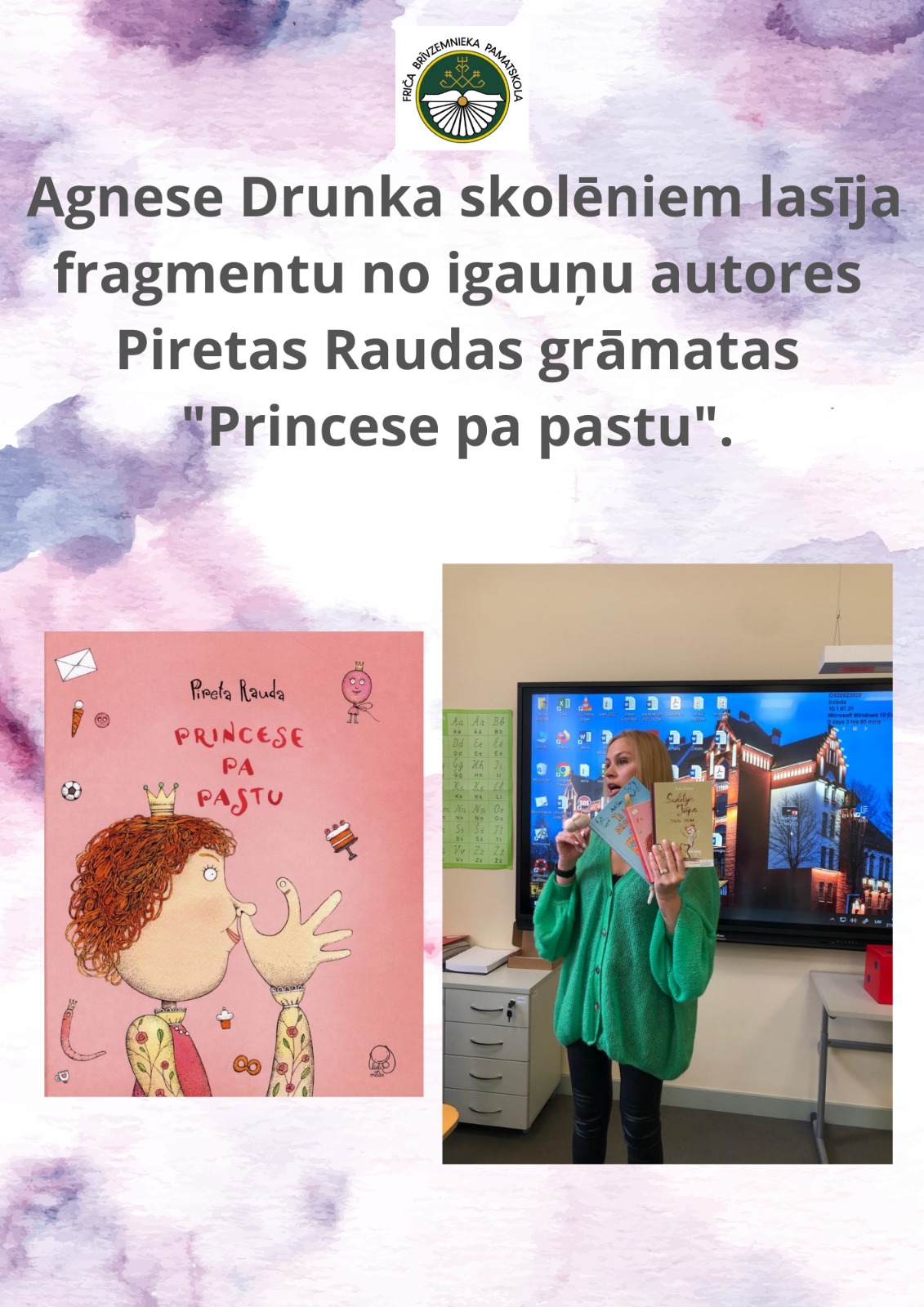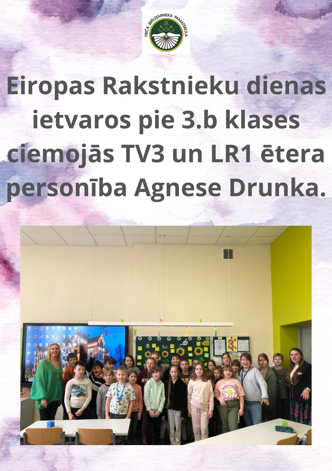 Pie 3.b klases ciemos ieradās TV un Latvijas Radio personība Agnese Drunka, kas lasīja lasījumus no igauņu rakstnieces Piretas Raudas grāmatas "Princese pa pastu", kā arī stāstīja par savu darbu televīzijā un profesiju.