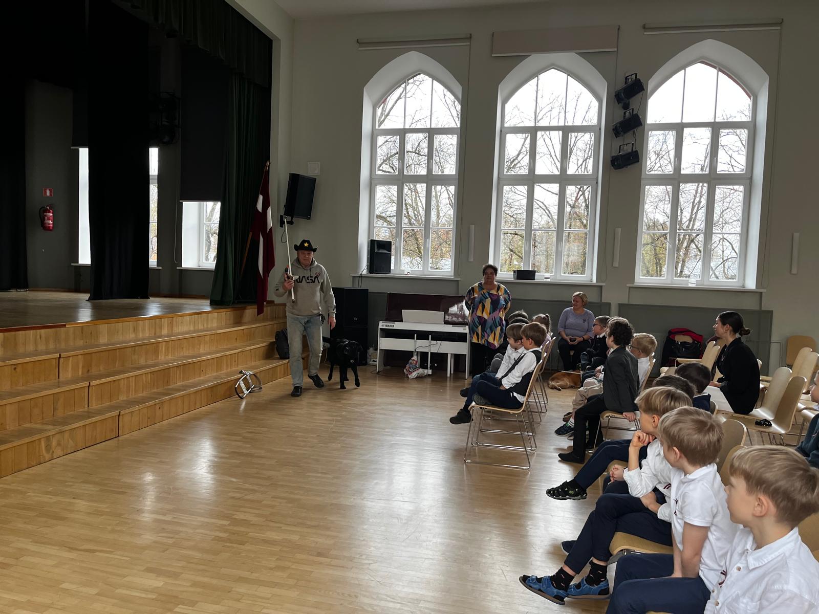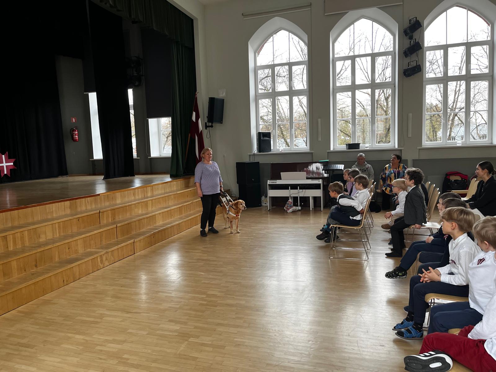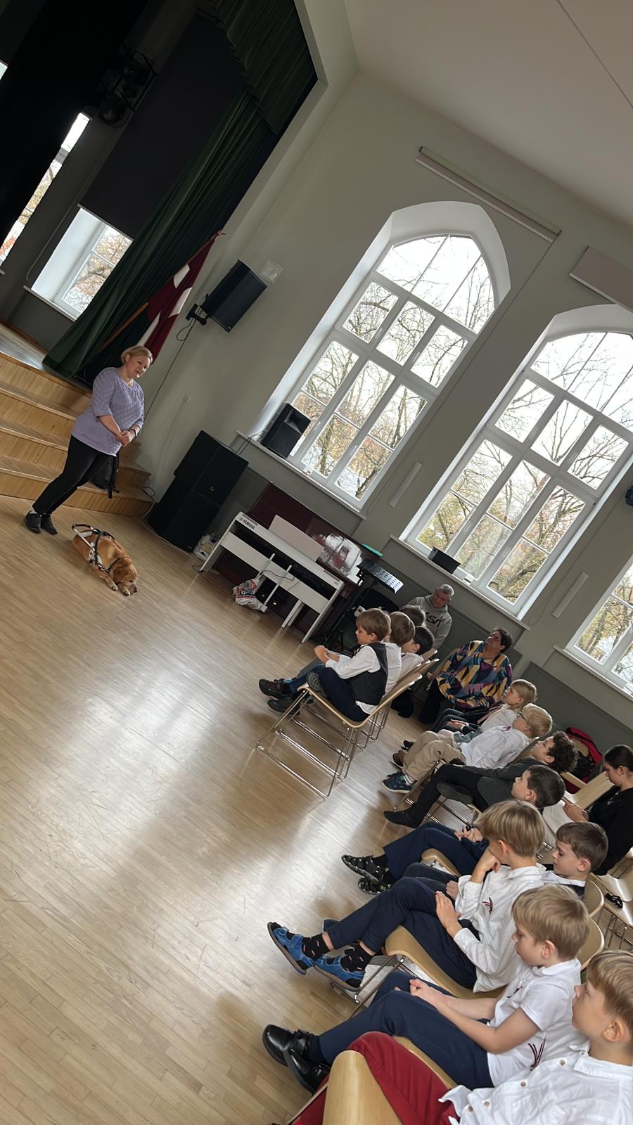 Ciemiņu vidū bija arī divi četrkājaini draugi - servisa suņi. Proti, Rīga un Neira. Skolēni ne tikai uzzināja, kas ir servisa suņi, kā tos atpazīt, kāpēc cilvēkiem ar redzes problēmām ikdienas gaitās var palīdzēt speciāli apmācīti suņi, bet arī, kas jāievēro, uz ielas satiekot neredzīgu cilvēku, kuru pavada īpaši apmācīts suns - servisa suns. Liels paldies ciemiņiem par izzinošo un ļoti vērtīgo nodarbību, gan fantastiskajām suņu dāmām - Rīgai un Neirai! Esam izglītoti, kas ir redzes problēmas, kā mēs ikviens ikdienā varam palīdzēt un atbalstīt neredzīgus cilvēkus, kā arī zinām, cik svarīgi ir šie speciāli apmācītie suņi - servisa suņi. Paldies par praktisko nodarbības daļu, kuras laikā ar speciālu briļļu un balto spieķu palīdzību izjutām, ko nozīmē orientēties vidē neredzīgam cilvēkam, cik svarīga šo cilvēku ikdienā ir tieši sunīšu sniegtā palīdzība.